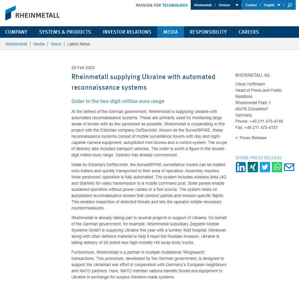 13.10 Немецкий оборонный концерн Rheinmetall начал поставлять в Украину автоматизированные разведывательные системы, говорится в заявлении компании.