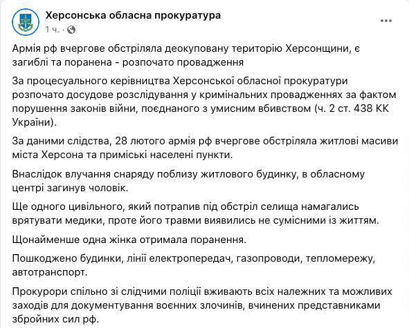 11.25 Россияне обстреляли Херсон, сообщили в Офисе президента.