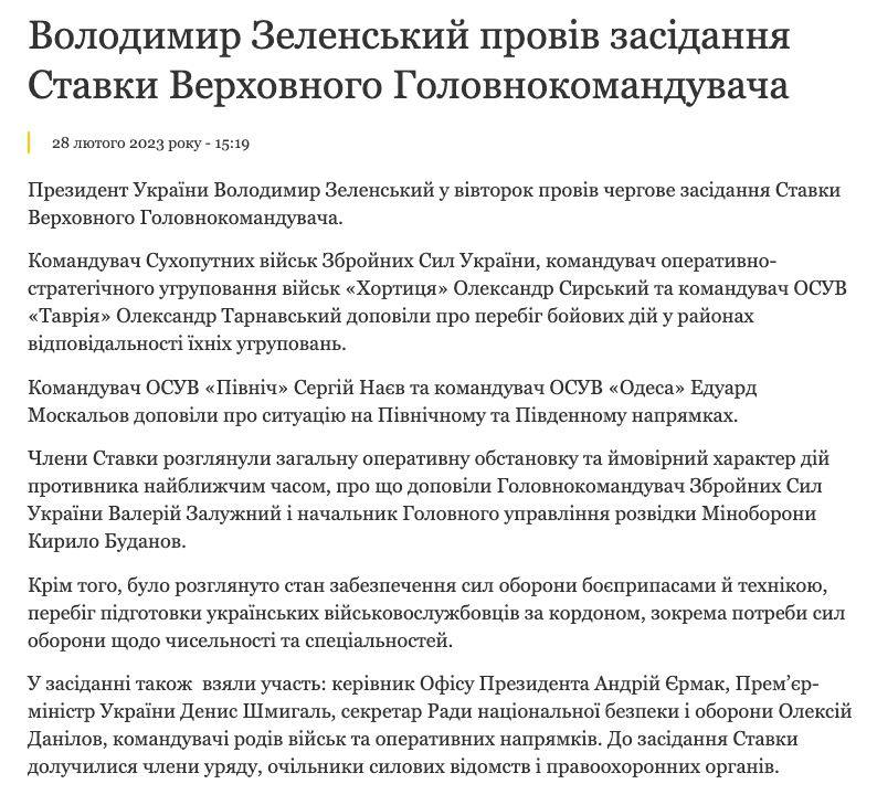 1. Сообщил о тяжелой ситуации в Бахмуте, которую рассматривали на заседании ставки. Докладывали ГУР, Министерство обороны, главком, командующие направлениями. Обсуждали и другие направления, в частности, Херсон.
