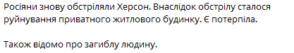 Россияне обстреляли Херсон. Разрушен частный дом, есть погибший и пострадавшая