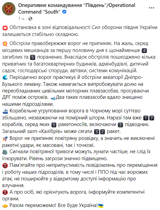 Об этом сообщает Оперативное командование "Юг" в Facebook.