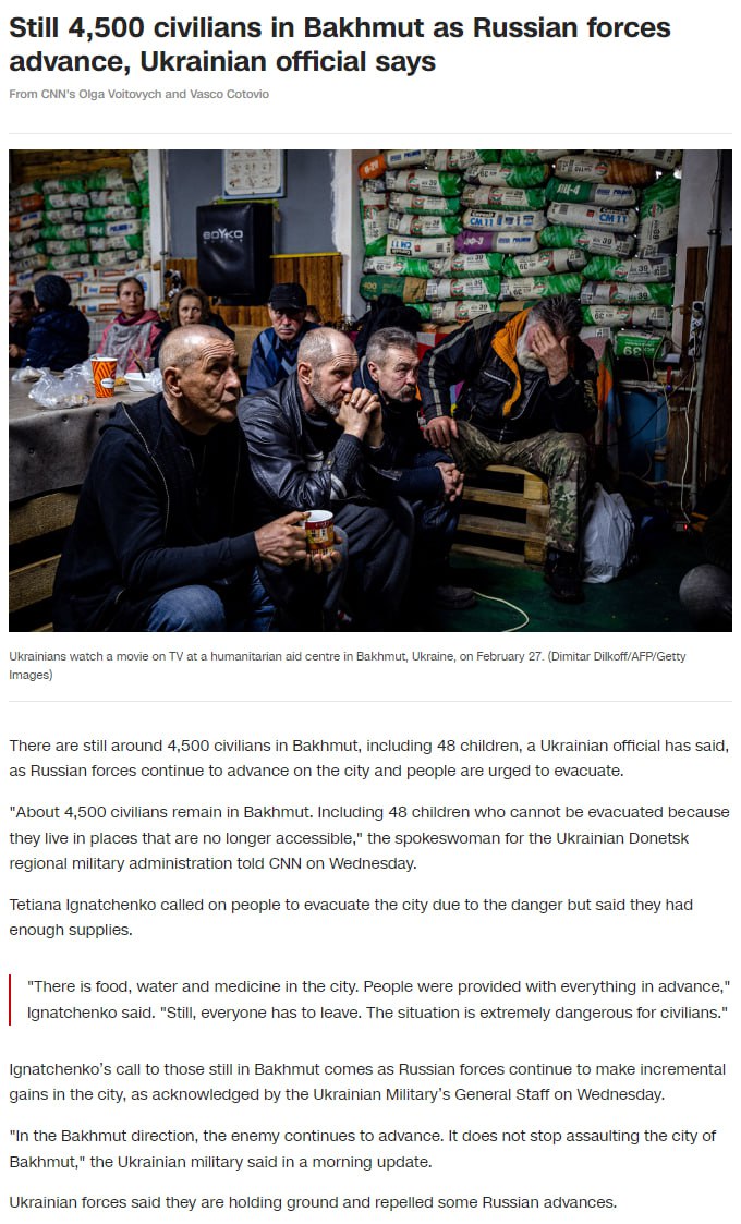 Ранее CNN сообщал, что ситуация в Бахмуте "намного хуже, чем сообщается официально". При этом поддержка украинской группы войск в Бахмуте зависит от контроля населенного пункта Хромово, который пытаются захватить россияне.