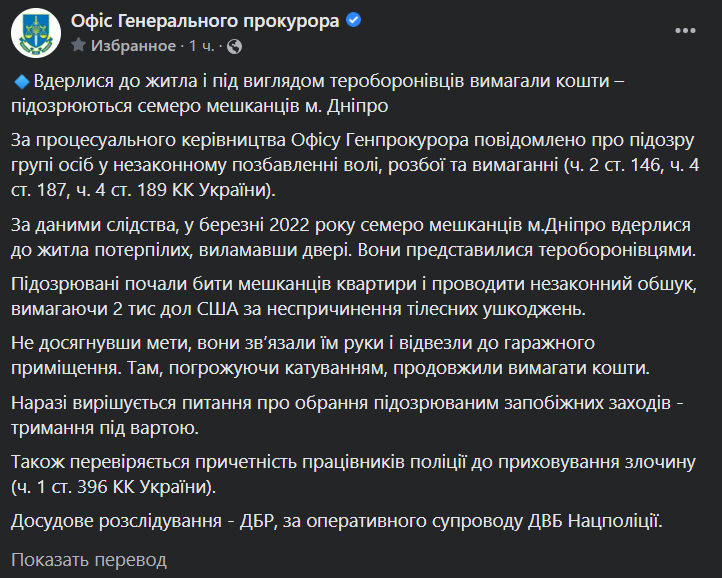 В Днепре в начале войны семеро мужчин, представившихся теробороной, вторглись в чужое жилье, устроили там обыск, избивали людей и требовали две тысячи долларов. Спустя год им вручили подозрения.