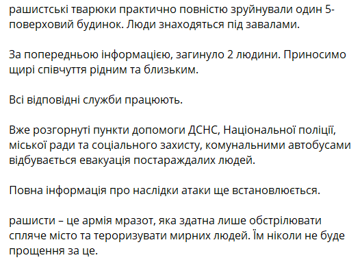 По его словам, на месте происшествия работают соответствующие службы. Развернуты пункты помощи ГСЧС, Нацполиции, горсовета и соцзащиты. Пострадавших людей эвакуируют на автобусах.