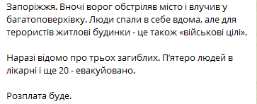 "Запорожье. Ночью враг обстрелял город и попал в многоэтажку. Люди спали у себя дома, но для террористов жилые дома – это тоже "военные цели". Пока известно о трех погибших. Пятеро человек в больнице и еще 20 - эвакуированы. Расплата будет", - написал Ермак.