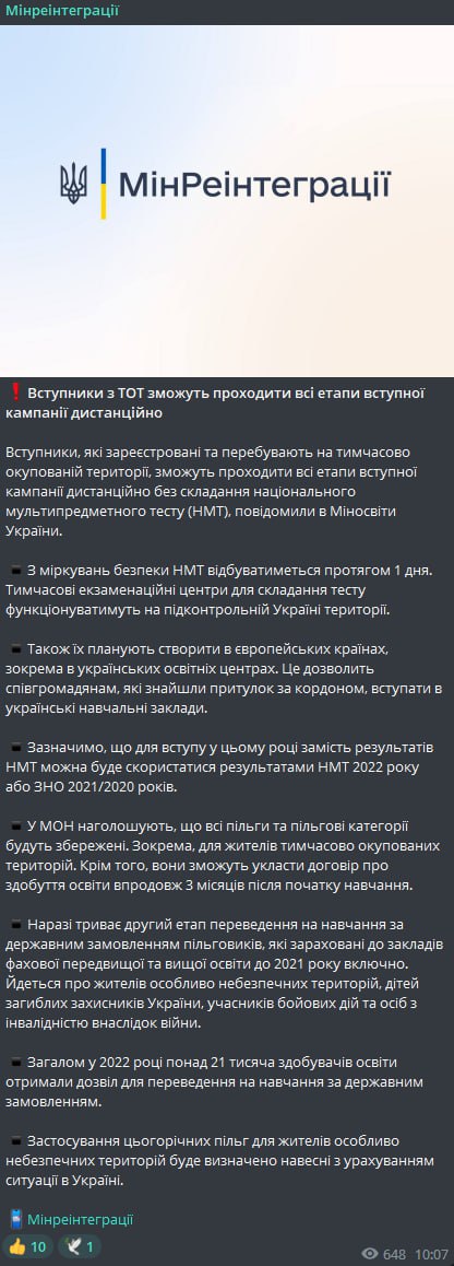 Из-за мер безопасности национальный мультипредметный тест (НМТ) будет проводиться 1 день. Временные экзаменационные центры будут работать на подконтрольной Украине территории.