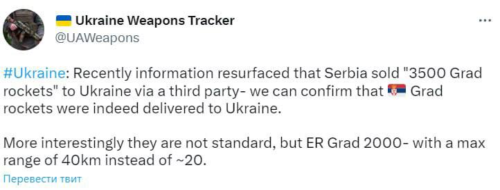 Так, аналитики Ukraine Weapons Tracker сообщили, что на вооружении ВСУ появились реактивные снаряды сербского производства для РСЗО "Град", поставленные Сербией через канадских и турецких партнеров.