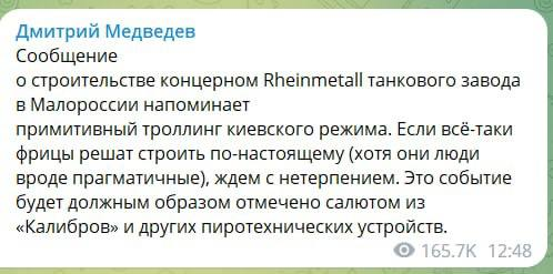 Зампред Совбеза РФ Дмитрий Медведев угрожает уничтожить ракетными ударами танковый завод, о намерении построить который в Украине объявила немецкая компания "Рейнметалл".