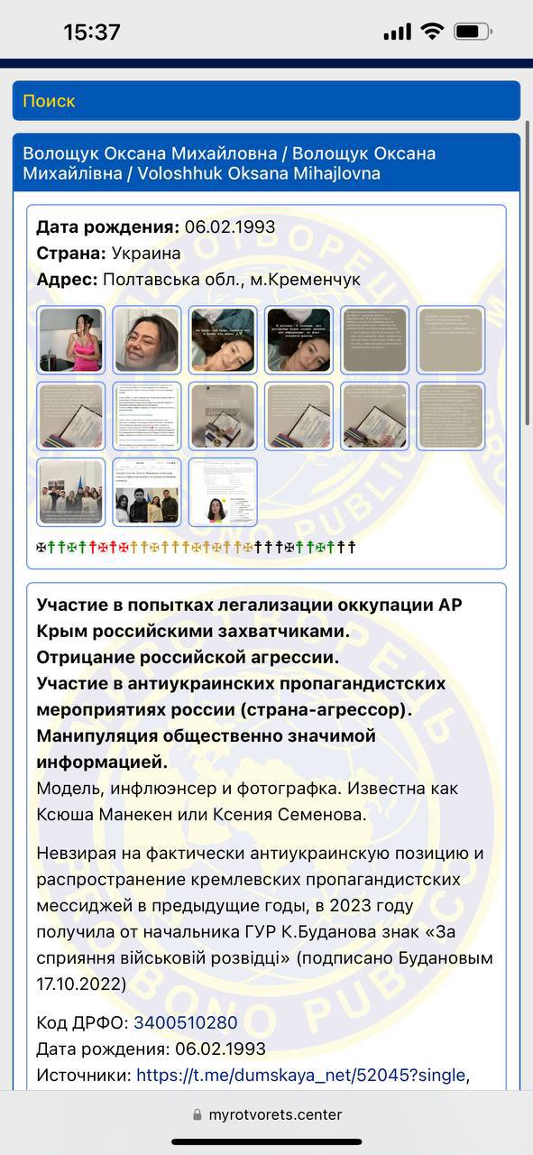 "За участие в попытках легализации оккупации АР Крым российскими захватчиками. Отрицание российской агрессии. Участие в антиукраинских пропагандистских мероприятиях россии (страна-агрессор). Манипуляция общественно значимой информацией", — написано на сайте "Миротворец".