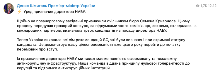 С назначением директора НАБУ у нас появляется полностью сформированая и независимая антикоррупционная инфраструктура. Наша команда привержена принципу нулевой толерантности к коррупции и поддержке антикоррупционных институций", - заявил Шмыгаль.