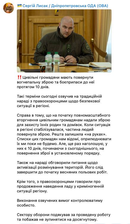 Власти Днепропетровской области призвали граждан в течение 10 дней добровольно сдать огнестрельное оружие и боеприпасы, которое массово раздавали в начале войны.