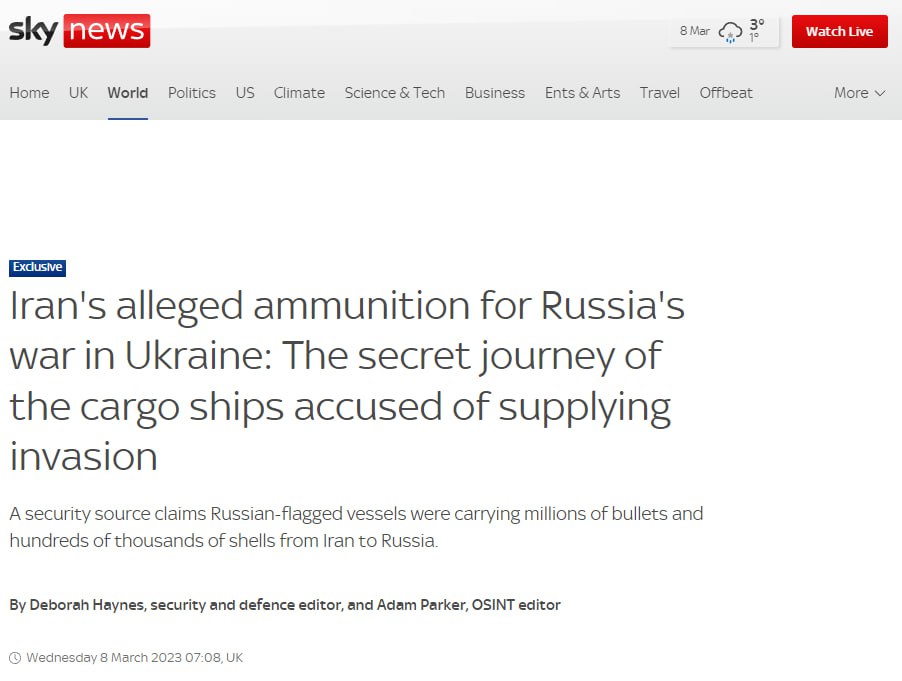 12.45 Иран тайно поставил большое количество пуль, ракет и минометных снарядов в Россию для войны против Украины и планирует отправить еще, сообщает Sky News.