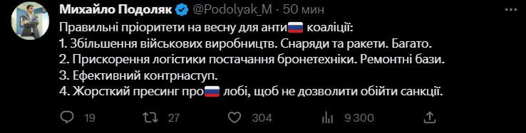 13.45 Советник главы ОП Подоляк перечисляет "правильные приоритеты на весну для антироссийской коалиции":