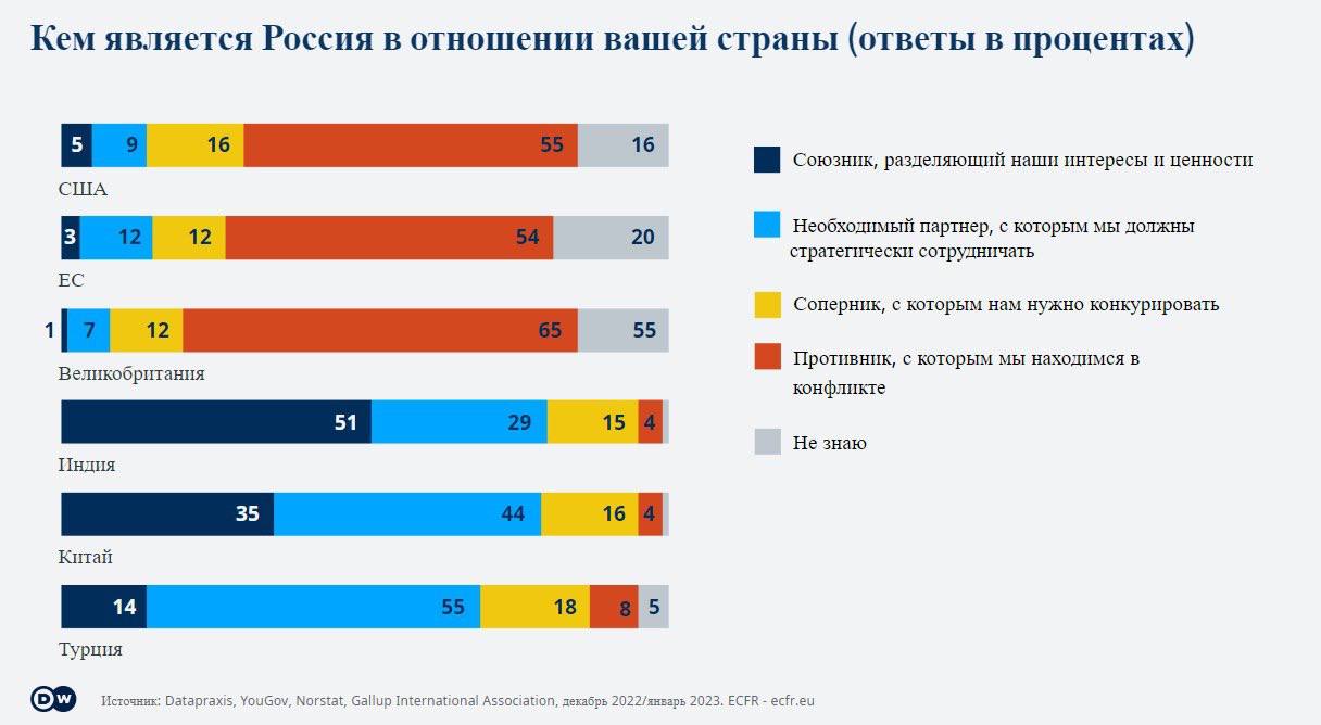Также, несмотря на войну, большинство жителей Индии (80%), Китая (79%) и Турции (69%) считают Россию "союзником", либо "партнером". В Европе и США преобладает мнение, что Россия является "противником" или "соперником".