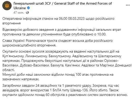 1. Силы РФ основные усилия сосредотачивают на наступлении на Купянском, Лиманском, Бахмутском, Авдеевском и Шахтерском направлениях в районах Орехово-Василовки, Дубово-Василовки, Бахмута, Каменки, Авдеевки и Марьинки Донецкой области. За прошедшие сутки ВСУ отбили более 100 атак противника на указанных направлениях.