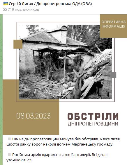 Утром 8 марта войска РФ обстреляли из тяжелой артиллерии Днепропетровскую область.