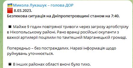 После шести утра под удар попала Марганецкая громада. Подробности обстрела уточняются.