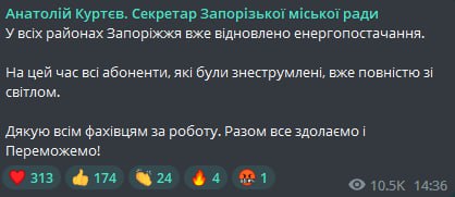 14:50 Во всех районах Запорожья уже восстановлено электричество.