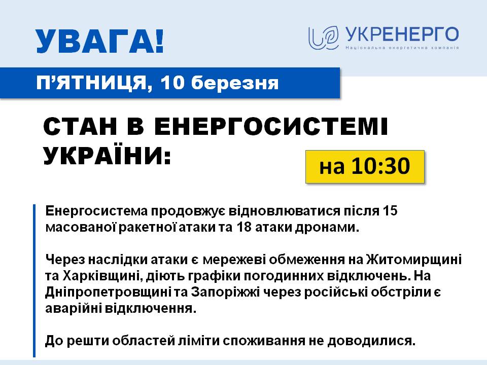 10.45 В Житомире и Харькове часть потребителей по-прежнему остаются без электроснабжения после вчерашней ракетной атаки, сообщает "Укрэнерго".