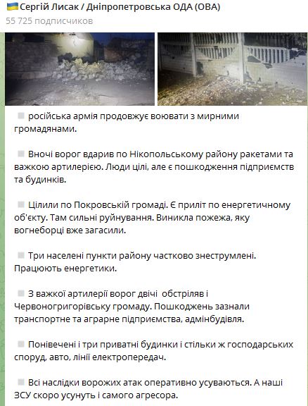 08.05 Ночью враг ударил по Никопольскому району ракетами и тяжелой артиллерией. Люди не пострадали, но есть повреждения предприятий и домов.