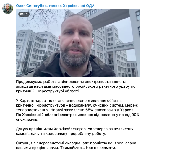 Также, по его словам, в Харькове полностью восстановлено питание объектов критической инфраструктуры – водоканала, очистных систем, сетей теплоснабжения.