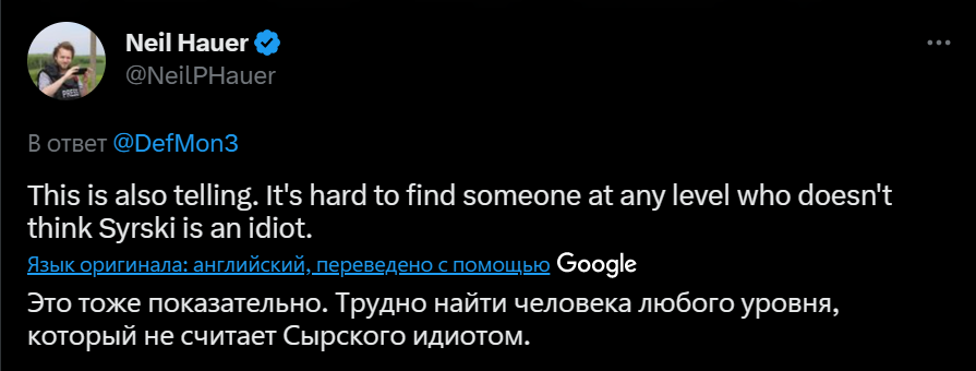 Это заявление перепостили западные военные блогеры. На него отреагировал канадский военный корреспондент Нил Хауэр, который работал в Украине. Он нелицеприятно высказался о главе Сухопутных войск Сырском и заявил, что "трудно найти человека любого уровня" в Украине, который бы так не считал.