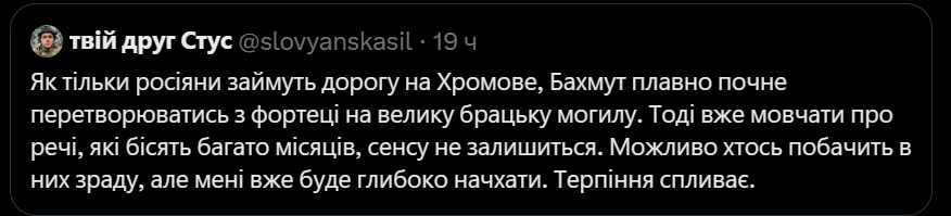 "Как только русские займут дорогу на Хромово, Бахмут постепенно начнет превращаться из крепости в большую братскую могилу. Тогда уже не будет смысла молчать о вещах, которые бесят много месяцев. Может быть, кто-то увидит в них зраду, но мне будет уже глубоко начхать. Терпение на исходе", - пишет военный.