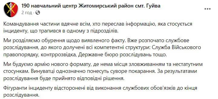 Появилась реакция командования учебного центра в Житомирской области на инцидент с избиением солдата офицером ВСУ.