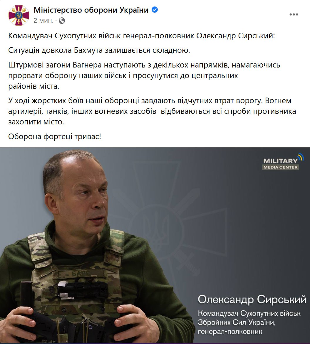 "Штурмовые отряды Вагнера наступают с нескольких направлений, пытаясь прорвать оборону наших войск и продвинуться к центральным районам города", - цитирует Сырского Минобороны Украины.