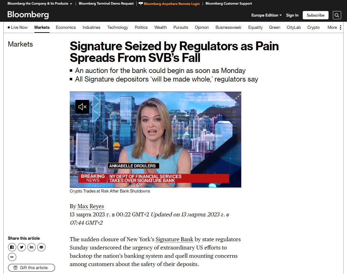 Регулятор в штате Нью-Йорк принял решение прекратить работу банка из-за системных рисков, говорится в совместном заявлении Минфина США, Федерального резерва и Федеральной корпорации по страхованию вкладов.