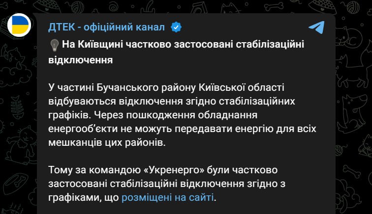 09.40 В некоторых районах Киева снова применяются стабилизационные отключения, сообщают в ДТЭК.