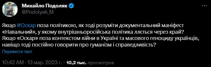 "Если "Оскар" вне политики, то как понимать документальный манифест Навального, где выплескивается внутренняя российская политика? Если Оскар вне контекста войны в Украине и массового геноцида украинцев, то почему вы постоянно говорите о гуманизме и справедливости?", - написал советник главы ОП Подоляк в Twitter.
