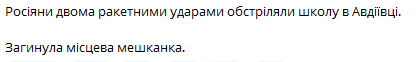 "Россияне двумя ракетными ударами обстреляли школу в Авдеевке. Погибла местная жительница", - сообщил он.