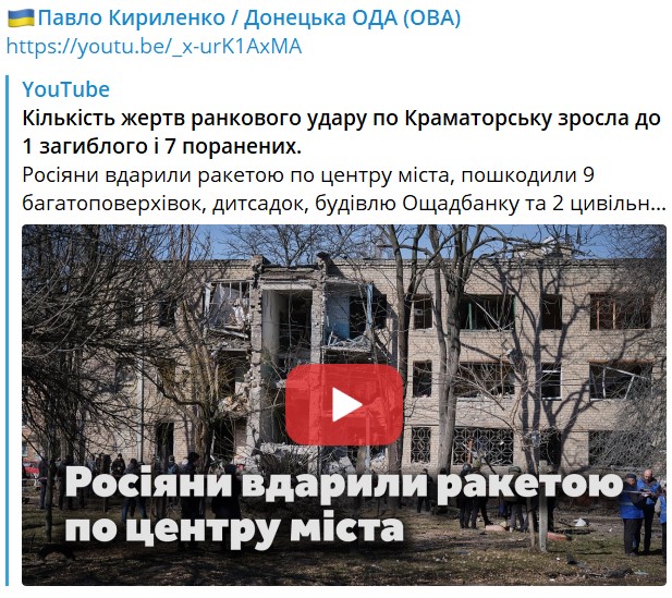Также сообщалось, что в результате удара РФ по Краматорску повреждены 26 домов и детсад.