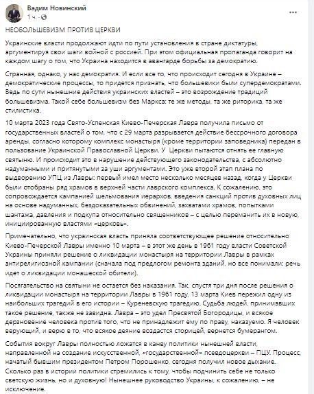 "На протяжении последних лет верные Украинской Православной Церкви не раз доказывали, что они готовы самоотверженно защищать свою Церковь. Крестные ходы в 2016 – 2018 годах собирали огромное число верующих. Власть, демонстрируя волюнтаризм (помните такой термин, популярный после отставки Хрущева?), рискует потерять доверие в глазах своего народа. Откровенным безумием являются действия, направленные на борьбу со своим народом в условиях кровавой войны с Россией. Или власть думает, что, запрещая Церковь и отнимая святыни, она мотивирует миллионы верных УПЦ быть патриотами Украины? Разве государство вправе систематически нарушать основные права граждан – в том числе право на свободу совести и свободу вероисповедания? Любая власть – временна... Духовный бумеранг всегда возвращается. И если нынешняя власть не верит в Бога, то должна усвоить хотя бы уроки истории", - пишет Новинский.