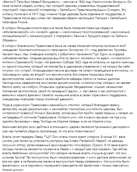 "В ХХ веке власти трижды пытались запретить служение в Лавре – и каждый раз проигрывали. Где сейчас власть безбожных коммунистов? Или сегодня наивные власть имущие думают, что они сильнее Христа? Так коммунисты были поорганизованнее, и ними двигала сатанинская, но все же идея, а не банальное желание выслужиться перед сюзеренами. Коммунисты были фанатиками, но в окружении нынешнего президента нет фанатиков – только прагматики, только циники", - пишет Новинский.