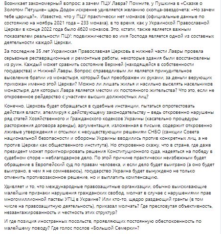 Также сообщалось, что настоятель Киево-Печерской Лавры заявил, что апокалипсис начинается с Украины, после требования покинуть комплекс. Также, по его мнению, Успенский и Трапезный соборы Киево-Печерской Лавры "осквернены" после передачи их ПЦУ.