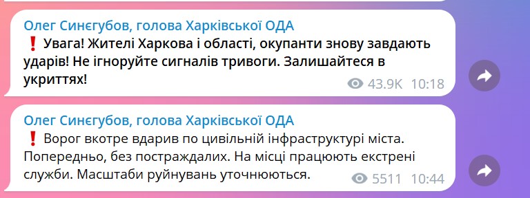 "Внимание! Жители Харькова и области, оккупанты снова наносят удары! Не игнорируйте сигналы тревоги. Оставайтесь в укрытиях", - написал он.