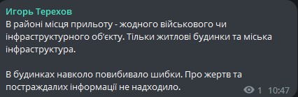 "В районе места прилета – ни одного военного или инфраструктурного объекта. Только жилые дома и городская инфраструктура. В домах вокруг выбило стекла".