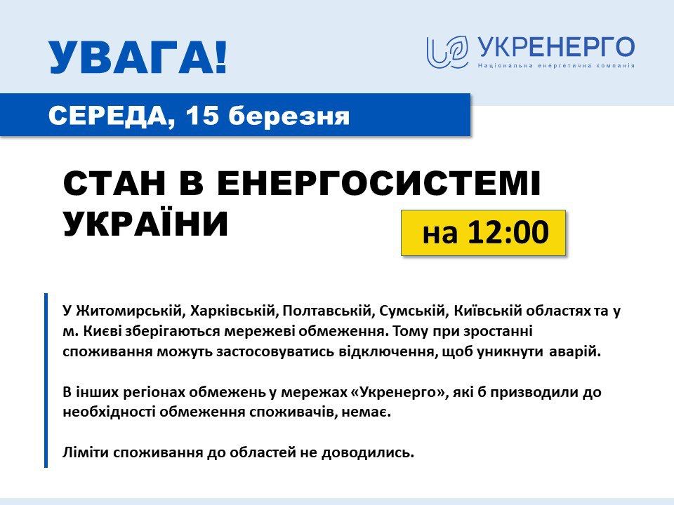 До ряда регионов сегодня, 15 марта, доведены лимиты потребления электроэнергии. Плановые отключения света в случае роста потребления возможны в Житомирской, Харьковской, Полтавской, Сумской, Киевской областях и Киеве.