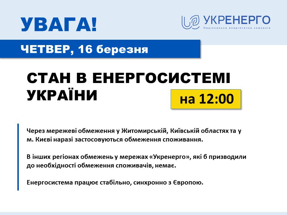 Об этом сообщает "Укрэнерго" в четверг, 16 марта.
