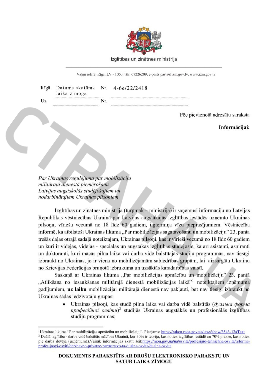 В нем говорится, что образовательное ведомство получает запросы от посольства Латвии в Украине на получение долгосрочных студенческих виз для украинцев призывного возраста, поступивших или уже обучающихся в местных вузах.