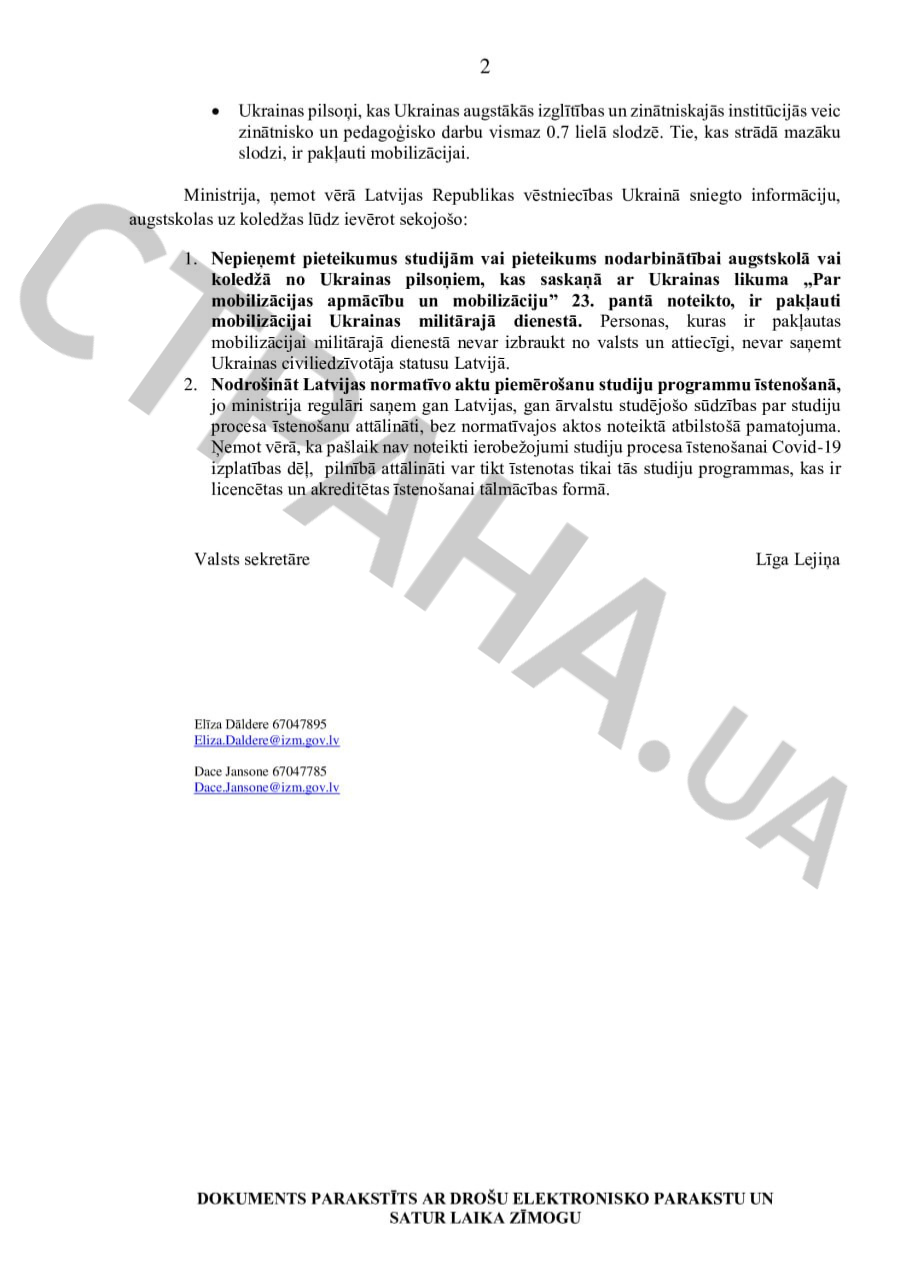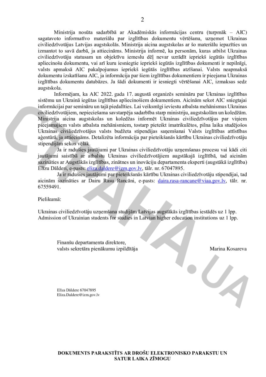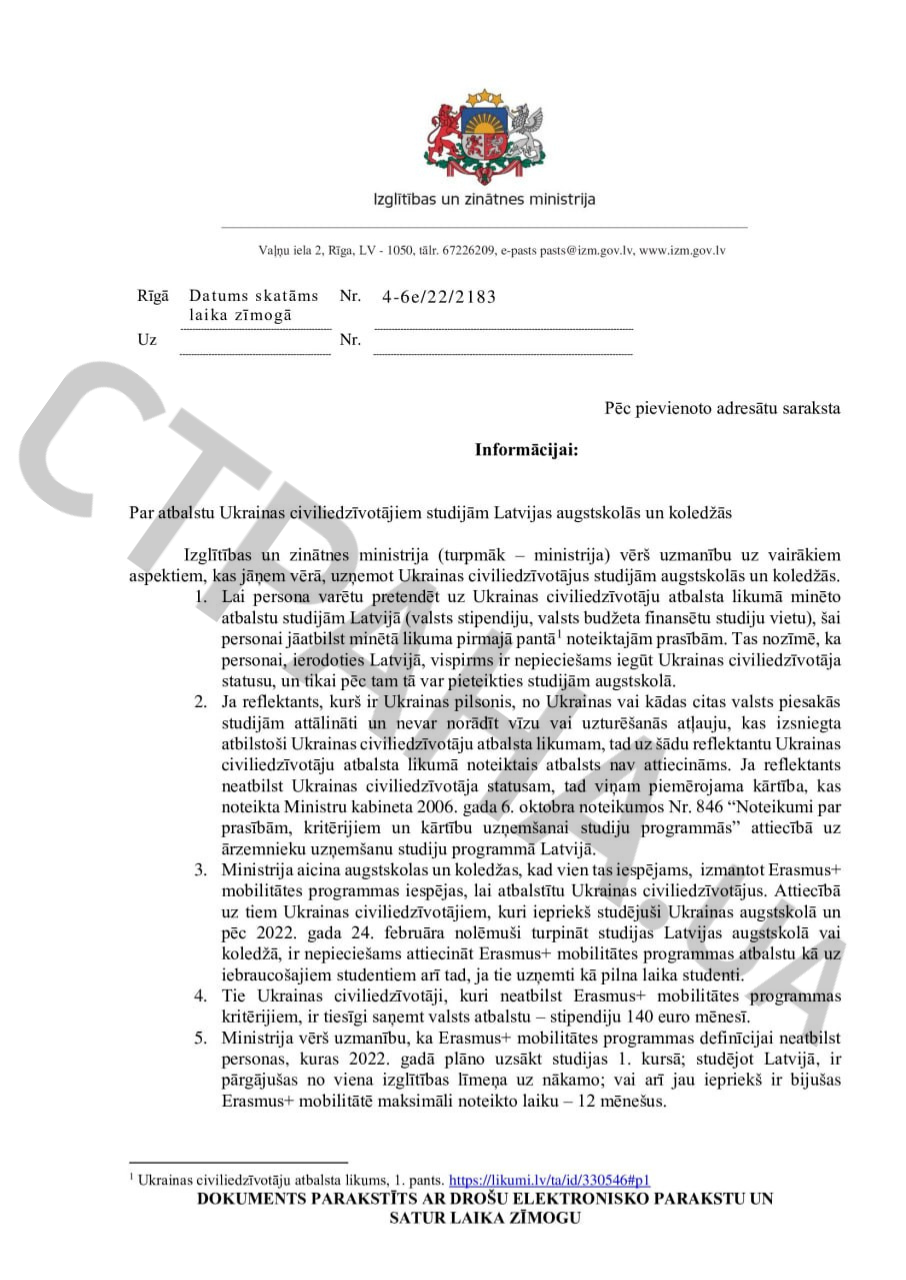 В первом письме, датированном 22 июля, перечислены аспекты, которые латвийское образовательное ведомство советует учитывать при приеме граждан Украины на учебу в местные вузы и колледжи.