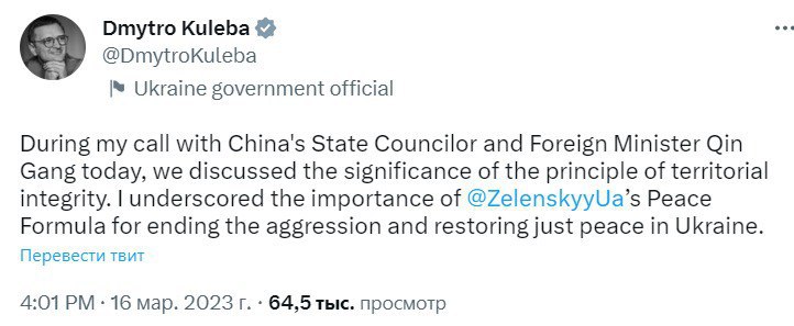 "Кулеба представил ситуацию украинского кризиса и перспективы мирных переговоров, поблагодарил Китай за оказание гуманитарной помощи Украине, сказал, что документ с изложением позиции Китая по политическому урегулированию украинского кризиса отражает искренность содействия прекращению огня и войны, и надеется поддерживать связь с Китаем.