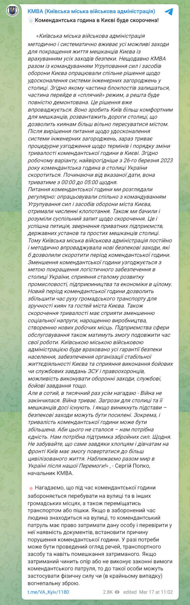 Отметим, ранее в Киевской городской военной администрации говорили, что в столице сокращать комендантский час не планируют.