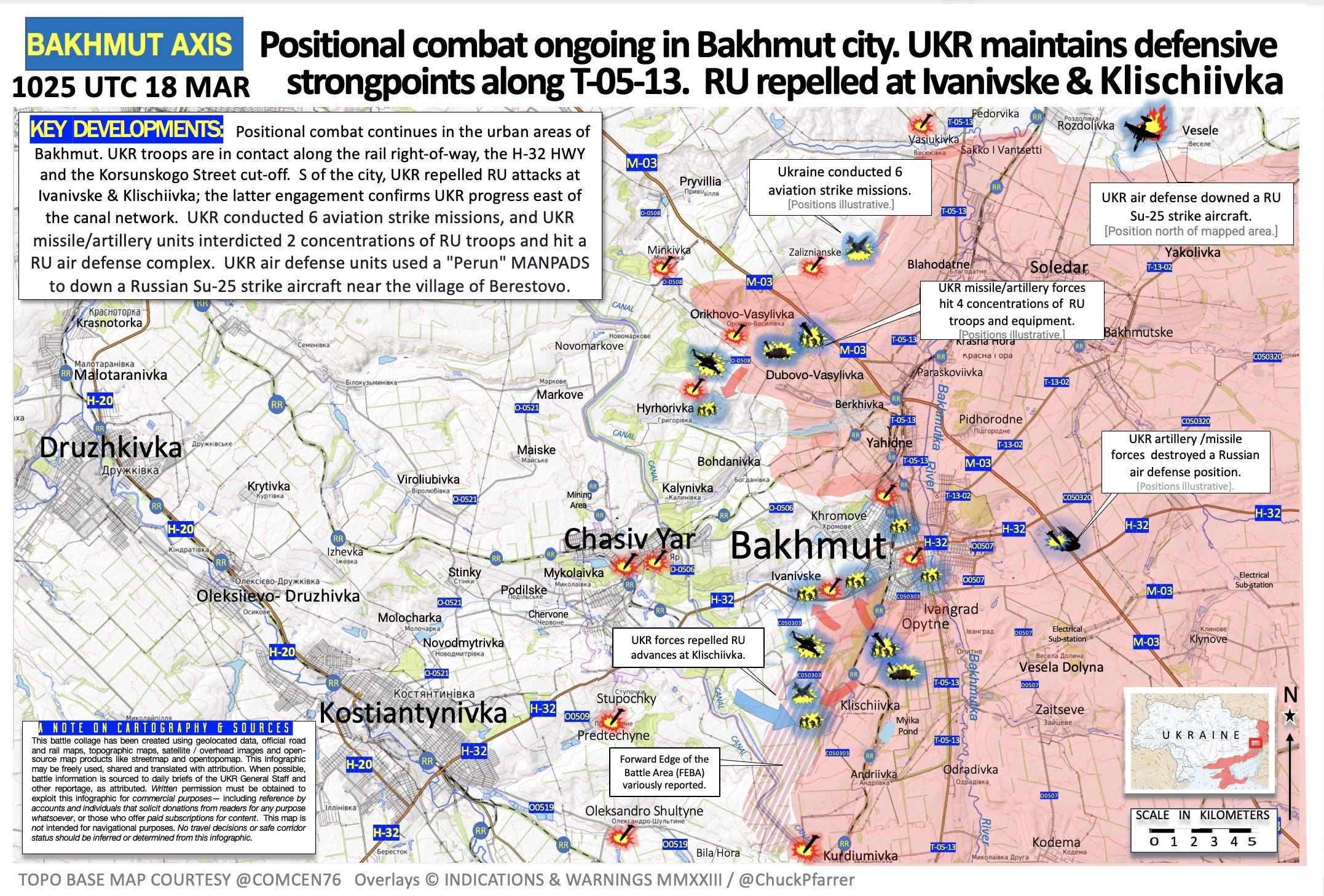 Американский обозреватель Чак Пфаррер пишет, что ВСУ смогли оттеснить россиян в ряде мест от трассы Бахмут-Константиновка в сторону Клещеевки. Позиционные бои продолжаются в городских районах Бахмута.