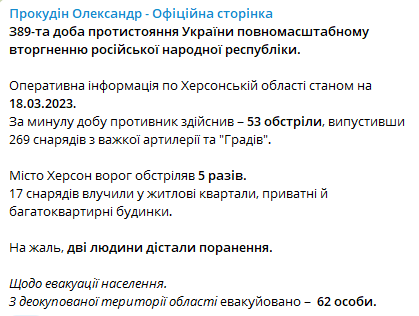 Российские войска за сутки 53 раза обстреляли Херсон и область, два человека получили ранения