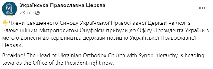 Они "прибыли в Офис Президента Украины с целью донести до руководства государства позицию Украинской Православной Церкви".