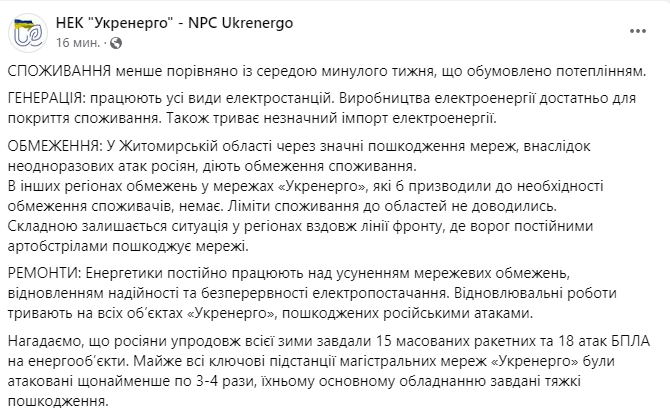 Ограничения электроснабжения из-за ударов по инфраструктуре в среду, 22 марта, сохраняются лишь в Житомирской области. В других областях ограничения не применяют.