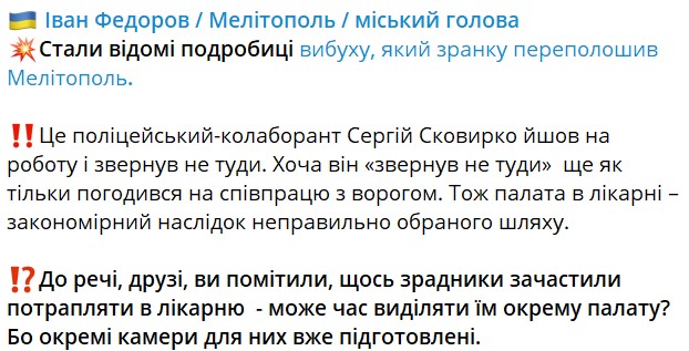 Мэр Мелитополя Иван Федоров назвал имя "полицейского", который пострадал утром 23 марта в результате взрыва в оккупированном городе.